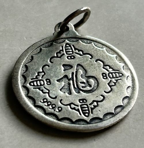The reverse side of this pendant shows the Chinese characters (Mandarin) for the animal. It is surrounded by a star design and sharply faceted silver circumference.