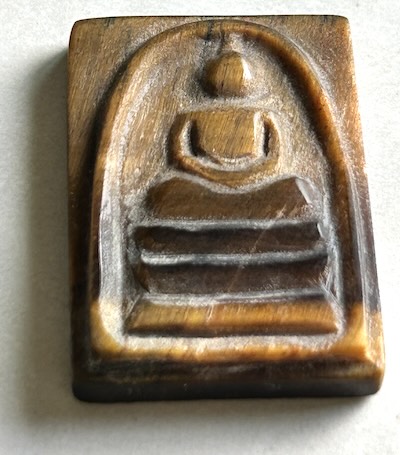 We only have 3 amulets left. We sold 8 already. Making Buddha pendants is a difficult process and each amulet has unique features apart from others made in the same batch. This is no different. These Tiger Eye stones are great quality, and the reverse side is left unfinished. This is the case with most Thai pendants that come from the temple. The focus isn’t always on producing a highly polished amulet.